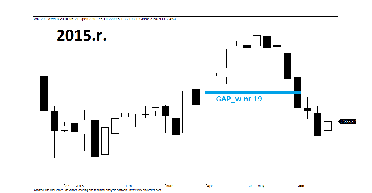 Pierwszy tydzień owego miesiąca przyniósł mocną zwyżkę aż o +4% w jeden tydzień zaś w kolejnym tygodniu byki zdołały wyciągnąć indeks o +3.7%. Na wykres pojawiła się tygodniowa luka hossy, która już wówczas zgodnie z wcześniejszymi obserwacjami powinna stanowić ostrzeżenie dla posiadaczy długich pozycji. Euforia na rynku trwała dokładnie 4 tygodnie od momentu wykształcenia się formacji GAP_w i 5 lipca 2012.r. wykształcił się szczyt – zalążek spadkowej fali znoszącej wcześniejszą zwyżkę. W kilka sesji ursusy dotarły tam gdzie chciały i chociaż rynek przez kolejne dni szukał jeszcze dna, to dla Teorii Magnetyczności Luk był to niezwykle ważny okres, gdyż jej wartość prognostyczna znacząco wzrosła. O tym jak bardzo, mogli przekonać się w 2015.r. zwolennicy grania longów a także uczestnicy konferencji WallStreet w Karpaczu, gdzie miałem przyjemność po raz pierwszy zaprezentować swoją koncepcję dotyczącą TML.