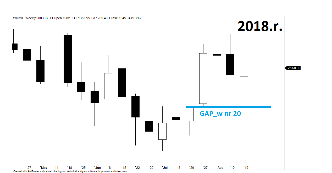 Rok 2004 to szczególny okres, w ramach którego wykształciły się aż 4 tygodniowe luki hossy, z których każda została domknięta na fali spadków zapoczątkowanych nie później niż w ciągu dwóch tygodni od momentu wykształcenia luki. Tutaj należałoby na chwilę się zatrzymać i zastanowić się, co robi WIG20 po domknięciu okna.