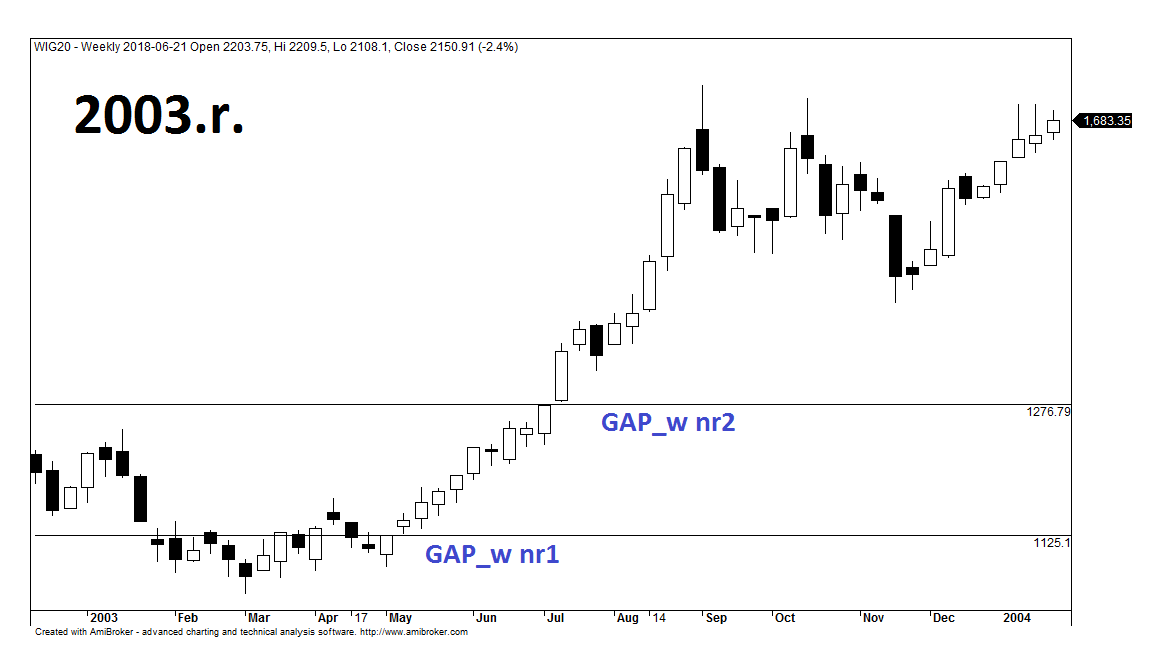 Pierwsza tygodniowa luka hossy w badanym okresie, pojawiła się w maju 2003.r., kiedy to rynek kończył bessę a apetyt na wzrosty był szczególnie wysoki. WIG20 otworzył się w poniedziałek 9 oczek powyżej sufitu poprzedniego tygodnia i po lekkiej korekcie byki rozpoczęły powolny marsz na północ. Po kilku dniach aprecjacji benchmark nadal przebywał powyżej okna hossy i w piątek finiszując na wysokości 1141 utrwaliła się pierwsza, od momentu wprowadzenia systemu WARSET, formacja GAP_w. Jak się później okazało była to jedyna przestrzeń na wykresie, która nie została w przyszłości wypełniona (można powiedzieć jeszcze nie wypełniona, gdyż strzałka czasu biegnie w kierunku prawym i temat powrotu do 1125.1 jest nieskończenie otwarty).