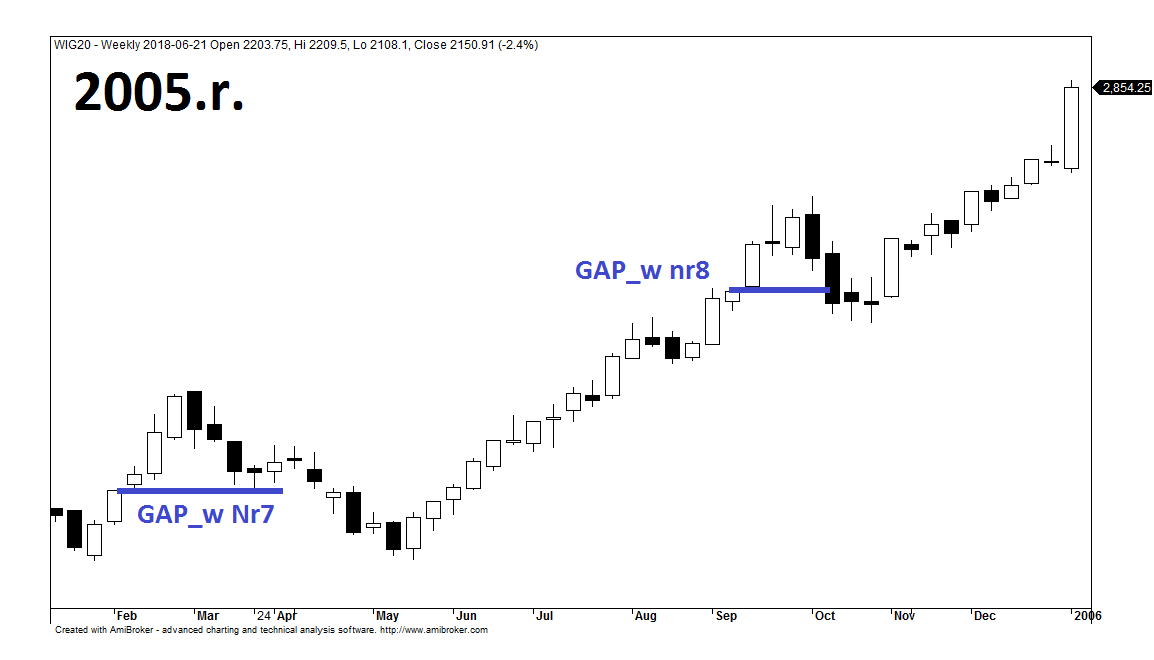 W 2005.r. pojawiły się już tylko dwie tygodniowe luki hossy, z których każda została domknięta na przestrzeni 2-3 miesięcy. W obu przypadkach indeks zachowywał się w różny sposób po fakcie wypełnienia punktowej wyrwy, mianowicie w kwietniu zamknięcie luki nie skutkowało wyprowadzeniem nowego impulsu hossy i benchmark cofnął się na roczne minima. W drugiej połowie byki wykazały się większą determinacją i korekta zaczęła tracić swój impet w okolicy, w której przebiegało okno. Pomimo rozbieżności wydarzeń w 2005.r. jak i 2004.r. można doszukać się pewnych prawidłowości dla ww. okresów, mianowicie na uwagę zasługuje czas, w jakim indeks robi szczyt po luce i zaczyna zmieniać lokalny trend. W ww. 6 przypadkach apogeum wzrostów następuje nie później niż 4 tygodnie od momentu wykształcenia się formacji GAP_w co oznaczałoby, że pojawienie się tej struktury generuje presję na spadki w określonym terminie. Jak będzie w kolejnych latach?