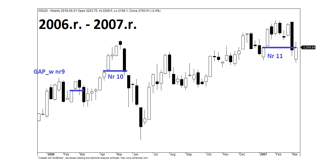 W 2006.r. pojawiły się dwa przypadki tygodniowej luki hossy zaś w 2007.r. jedynie jeden. Każde okno ściągnęło do siebie WIG20 w kolejnych miesiącach, zaś w każdym z trzech ww. przypadków indeks zaczynał proces domykania nie później niż po 4 tygodniach od momentu wykształcenia się formacji GAP_w. Rok 2007.r. to pamiętny okres, kiedy to bańka na rynku nieruchomości pękła i na światowe parkiety rozlała się podaż akcji spychająca kluczowe indeksy na południe. Wraz z pojawieniem się rynku niedźwiedzia, liczba tygodniowych okien hossy zaczęła maleć . Podczas całej bessy pojawiły się jedynie dwa niewielkie okna domknięte w krótkim przedziale czasu.