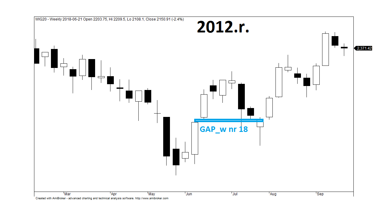 W 2009.r. wykształciły się trzy luki i jak można się domyślać, niedźwiedzie wykorzystały to jako pretekst do zajęcia krótkiej pozycji. W każdym z ww. przypadków, WIG20 potrzebował maksymalnie 3-4 tygodnie na zbudowanie szczytu, po których zaczynał się proces domykania tygodniowych formacji GAP_w. Na kolejną lukę należało zaczekać aż do czerwca 2012.r., kiedy to po kilkunastu miesiącach deprecjacji pojawiły się pierwsze sygnały zmiany trendu.