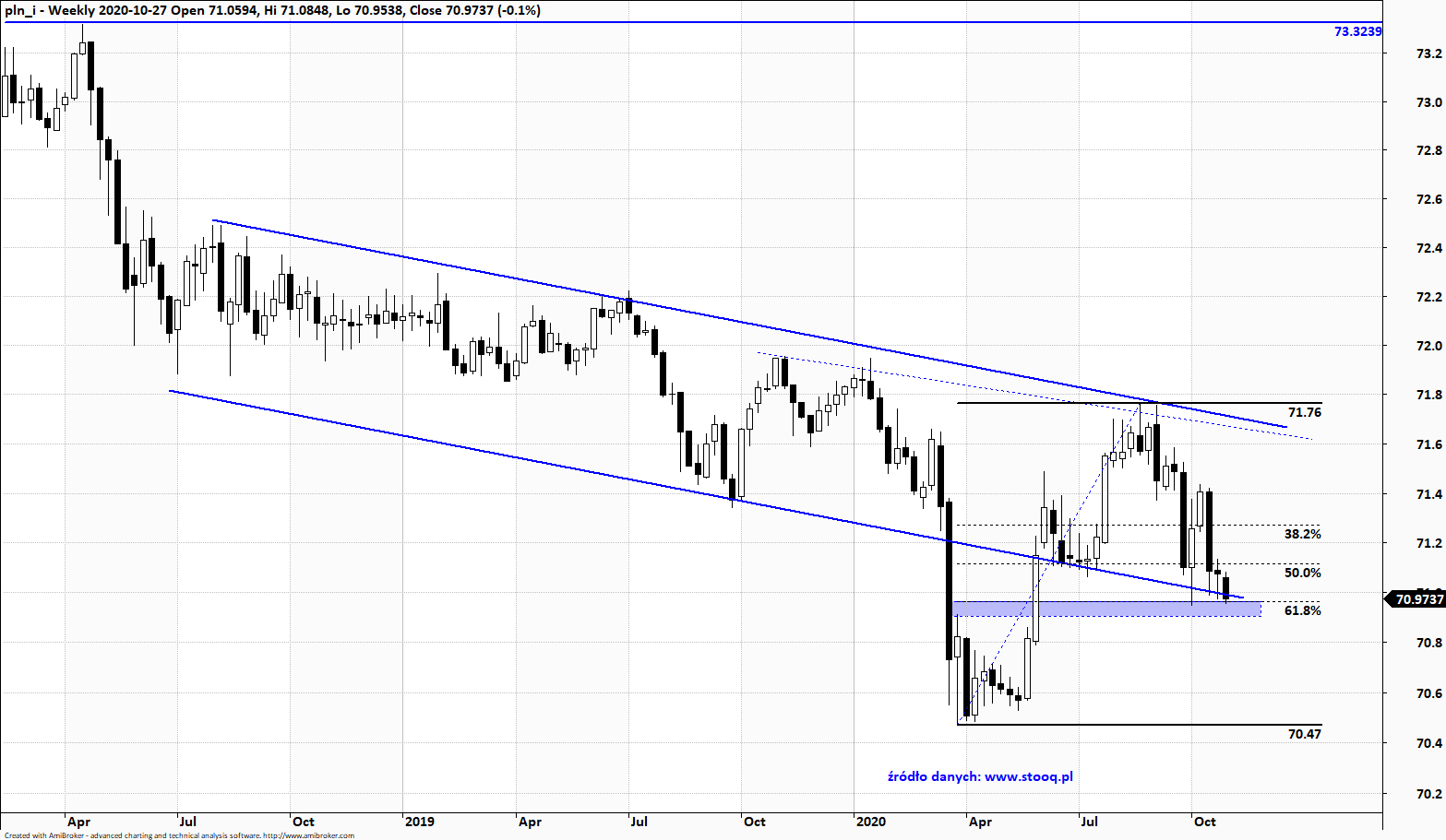 Zagranica jak na razie nie śpieszy się do tego, aby odwrócić trend na złotym. Lokalnie trwa obrona ważnej strefy wsparcia, zatem nie można wykluczyć, że PLN_Index obroni się na bieżących poziomach, jednakże sekwencja szczytów, układ tygodniowych świeczek, trend, średnie etc. wciąż są na niekorzyść polskich byków a to znów uderza w WIG czy WIG20.