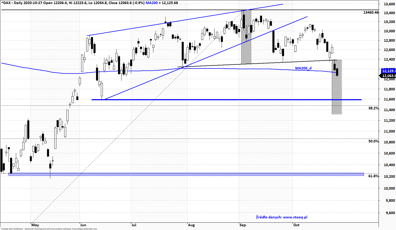 Niemiecka Xetra jak po sznurku realizuje spadkowy scenariusz, jaki został napisany w momencie wyłamania dolnego ograniczenia klina. O zagrożeniu, jaka stwarza to formacja i czego należałoby się oczekiwać pisałem na ostatnim wpisie, zatem teraz pozosaje jedynie pogratulować niedźwiedziom konsekwencji. Niestety osuwająca się wycena DAX sprawia, że łamane są kolejne wsparcia m.in. dzienna dwusetka. SELL by MA200_d to niestety kolejny pretekst do dalszych spadków i jeżeli na Deutsche Boerse nie pojawią się byki odkręcajace ten sygnał, DAX czeka podróż w kierunku 10000 punktów. Na korzyść ursusów przemawia dodatkowo G&R z zasięgiem w kierunku 38.2% a tym samym dotychczasowe wskazania AT stałyby się jeszcze bardziej wiarygodne. Od północy na uwagę zasługuje 12.8k i do tej wysokości przewagę mają niedźwiedzie.